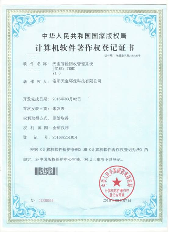 公司溶劑回收設(shè)備的控制系統(tǒng)--------“天寶智能回收管理系統(tǒng)”獲國(guó)家版權(quán)局下發(fā)的軟件著作權(quán)登記證書(shū)。該證書(shū)的取得,表明了公司開(kāi)發(fā)的有機(jī)廢氣回收設(shè)備的自動(dòng)化控制系統(tǒng),同公司取得的發(fā)明***一樣,得到了國(guó)家權(quán)威管理部門(mén)的認(rèn)可,是公司自主知識(shí)產(chǎn)權(quán)和核心技術(shù)的一個(gè)重要組成部分。對(duì)于提升公司產(chǎn)品品質(zhì)和智能化控制與操作水平,提高市場(chǎng)競(jìng)爭(zhēng)力,形成持續(xù)創(chuàng)新能力有著積極的促進(jìn)作用。