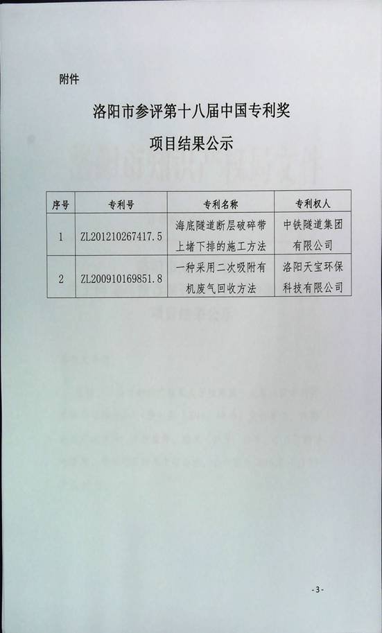 公司***“一種采用二次吸附有機(jī)廢氣回收方法”(***號:ZL 2009 1 0169851.8)被高新區(qū)和洛陽市推薦參加中國第十八屆***獎的評選。